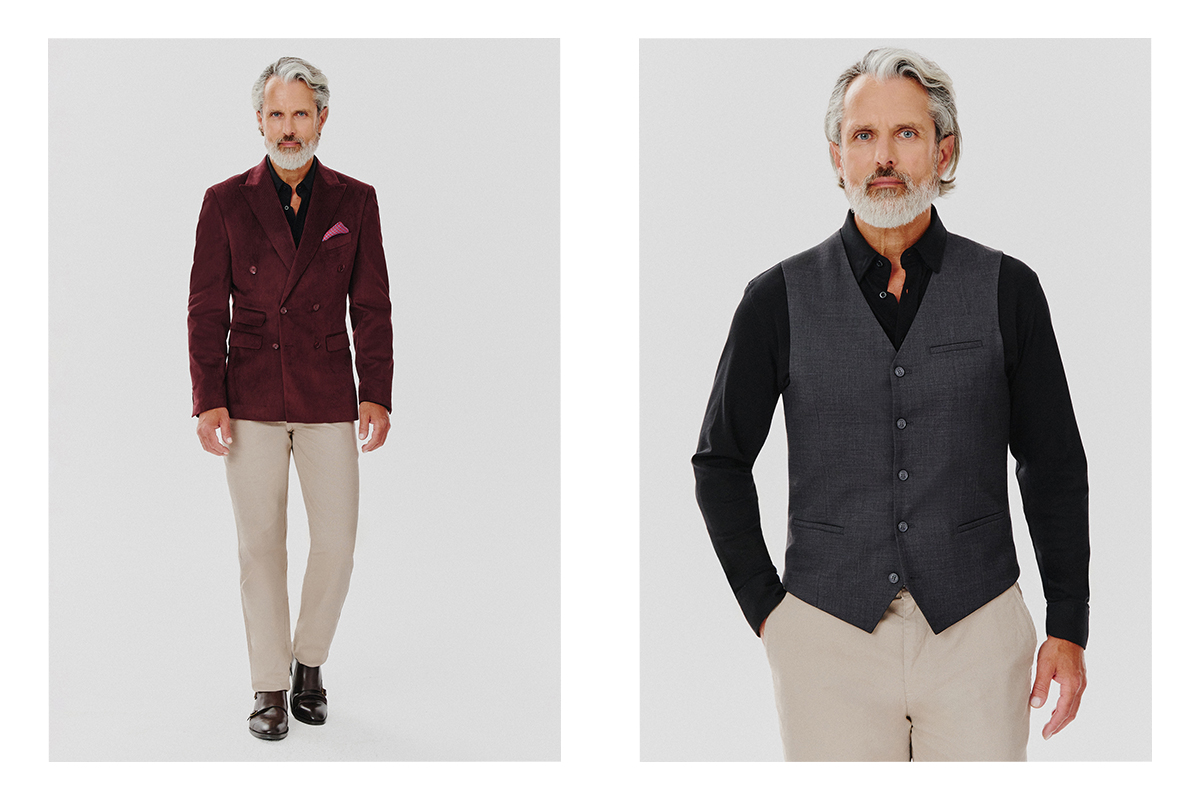 To jeden z najbardziej stylowych i bezpiecznych wyborów. Granat świetnie łagodzi czerń i tworzy zestaw biznesowy, wieczorowy lub smart casual. Sprawdzi się praktycznie zawsze. - Szara marynarka