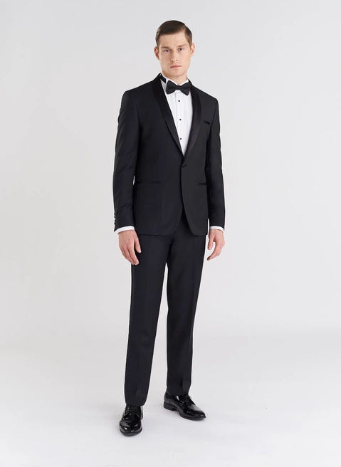 To wyjątkowy zestaw, który wymaga odpowiedniej oprawy: dobiera się do niego czarną muchę, śnieżnobiałą koszulę na spinki z krytą listwą lub jubilerskimi guzikami, a także jedwabny bądź satynowy pas smokingowy. Całość dopełniają lakierowane pantofle lub czarne oxfordy.