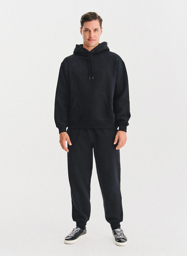 Czarny dres męski z bluzą z kapturem U25WB-2K/WD-001-C-0 Męski zestaw dresowy z nowej kolekcji od Pako Lorente, który łączy elegancję z wygodą. Męska bluza dresowa typu kangurka z charakterystyczną dużą kieszenią z przodu, która bez trudu pomieści niezbędne drobiazgi. Model w czarnym kolorze z kapturem, wykonany z mieszanki bawełny i poliestru. Rękawy i dół bluzy wykończone ściągaczem. Spodnie o luźnym kroju. Posiadają dwie kieszenie i gumę w pasie regulowaną sznurkiem. Nogawki zakończone elastycznym ściągaczem.