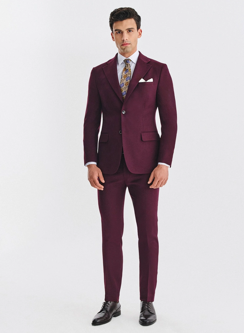 Bordowy garnitur został wykonany w 84% z poliestru, w 14% z wiskozy i w 2% z elastanu. Marynarka posiada dwie kieszenie kryte patką. Spodnie zapinane na maskowany zamek błyskawiczny i guzik, posiadają nogawki zaprasowane w kant. Fason garnituru Super Slim idealnie podkreśli atuty wysportowanej, męskiej sylwetki.