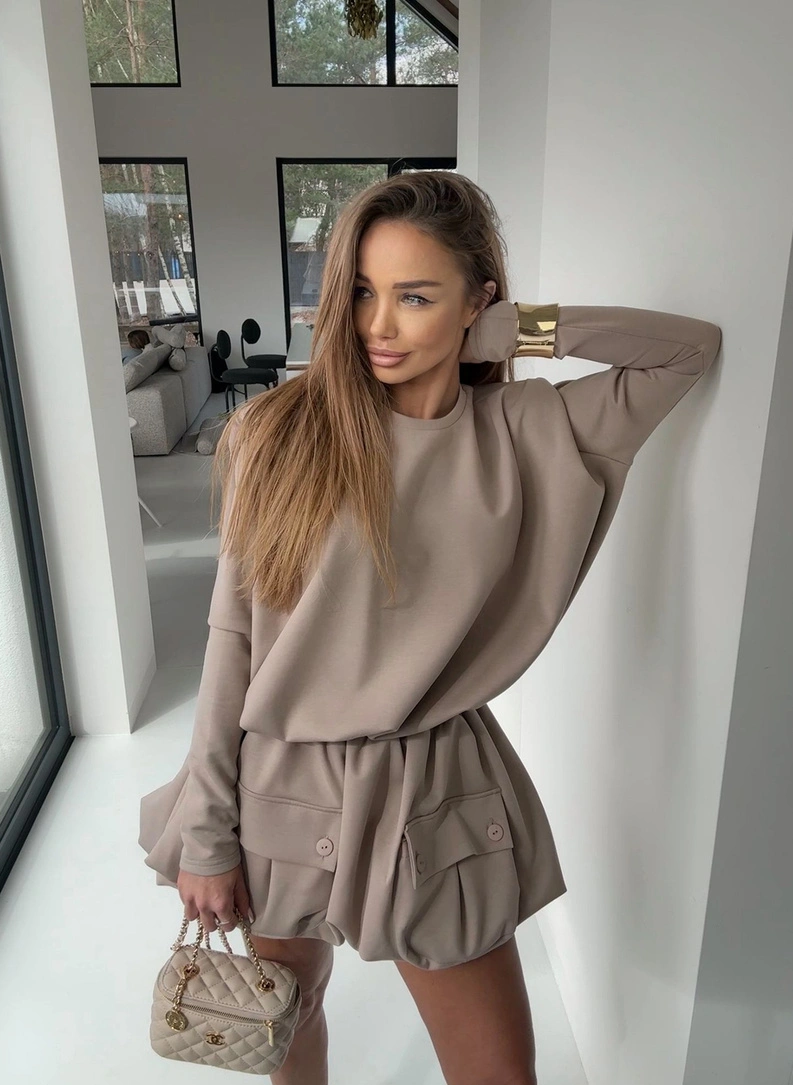 Dół zestawu stanowi krótka spódniczka o charakterystycznym, objętościowym fasonie bombki, który pięknie eksponuje nogi. Wyraźne marszczenie w pasie za pomocą elastycznej gumy, co pozwala na idealne dopasowanie i podkreślenie sylwetki. Najbardziej wyróżniającym się elementem są dwie duże, naszywane kieszenie z przodu. Posiadają ozdobne klapy zapinane na guziki w kolorze materiału, co nadaje całości nieco militarno-użytkowego charakteru. Dwuczęściowy dzianinowy komplet MONO PURE to idealny balans między sportowym luzem a kobiecą elegancją. Dzięki unikalnej formie spódnicy zestaw nie wymaga wielu dodatków – sam w sobie stanowi mocny punkt stylizacji. Świetnie prezentuje się ze szpilkami, co wydłuża sylwetkę, ale równie dobrze będzie wyglądać z masywnymi sneakersami lub botkami na platformie. Komplet idealny na spotkanie ze znajomymi, zakupy, a przy odpowiednich dodatkach – również mniej formalne wyjście wieczorowe.