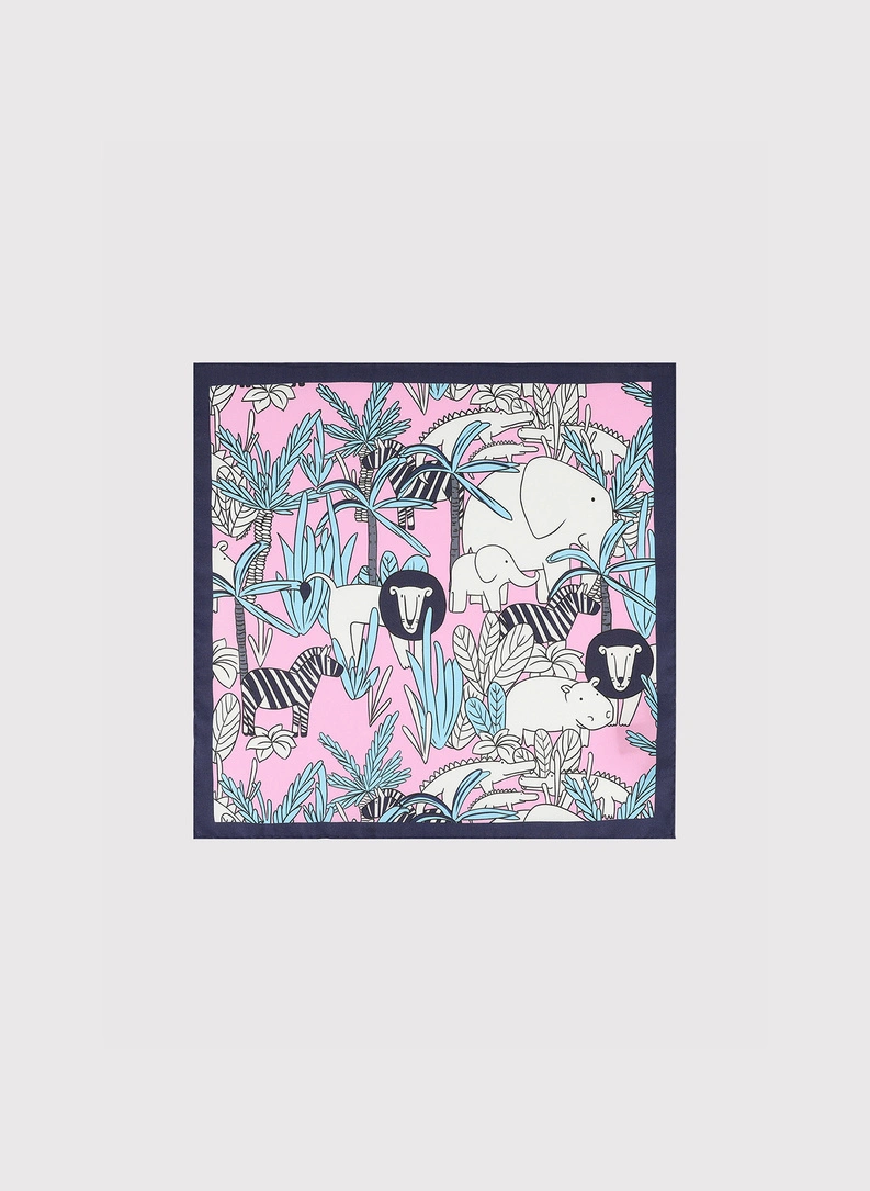 Poszetka została zaprojektowana w klasycznym, kwadratowym formacie 30x30 cm, który ułatwia formowanie zarówno prostych, jak i bardziej fantazyjnych ułożeń. Jedwabna powierzchnia pięknie łapie światło, nadając różowi głębi i elegancji. Na tle różowego koloru wyeksponowano delikatne motywy zwierzęce, które widoczne są szczególnie po złożeniu poszetki w szpic lub puff – w brustaszy pojawia się wtedy intrygujący detal, przyciągający wzrok.
