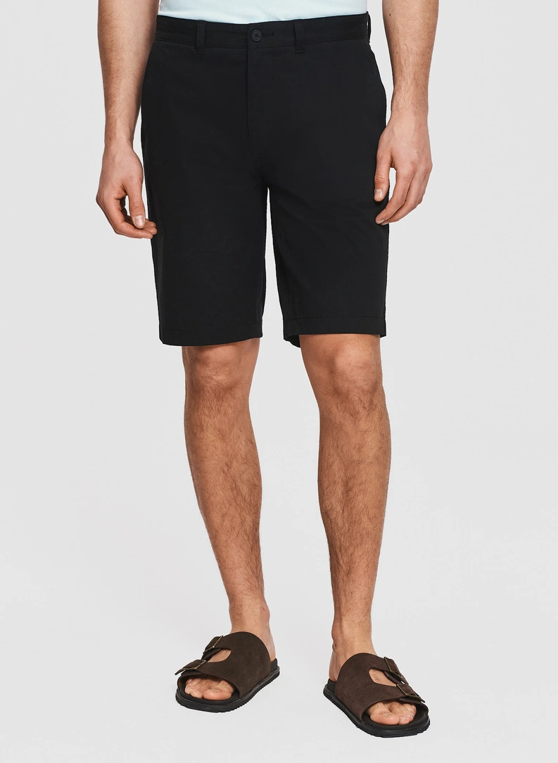 Regularny fason szortów opiera się na prostych nogawkach o wyważonej szerokości, które nie opinają ud, a jednocześnie nie tworzą wrażenia zbyt obszernego ubrania. Standardowa wysokość stanu pozwala wygodnie ułożyć pas w okolicy talii, co sprzyja stabilnemu trzymaniu się szortów na biodrach przez cały dzień. Wygodne zapięcie w pasie (zamek z guzikiem) ułatwia szybkie zakładanie i zdejmowanie, a dobrze skrojony pas współpracuje z paskiem, jeśli chcesz dodatkowo podkreślić linię talii. Przemyślany układ kieszeni zapewnia miejsce na drobiazgi, takie jak telefon, portfel czy klucze, bez nadmiernego obciążania sylwetki.