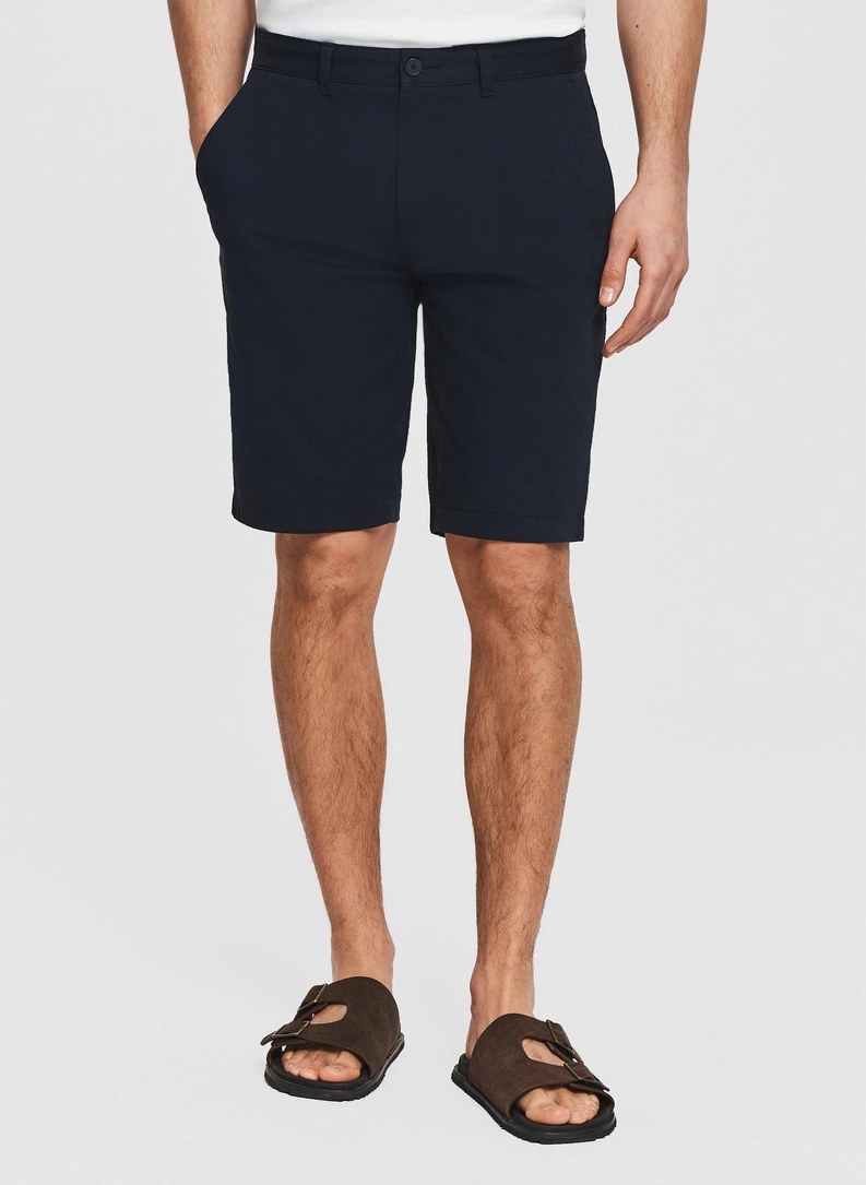 Regularny fason szortów opiera się na prostych nogawkach o wyważonej szerokości, które nie opinają ud, a jednocześnie nie tworzą wrażenia zbyt obszernego ubrania. Standardowa wysokość stanu pozwala wygodnie ułożyć pas w okolicy talii, co sprzyja stabilnemu trzymaniu się szortów na biodrach przez cały dzień. Wygodne zapięcie w pasie (zamek z guzikiem) ułatwia szybkie zakładanie i zdejmowanie, a dobrze skrojony pas współpracuje z paskiem, jeśli chcesz dodatkowo podkreślić linię talii. Przemyślany układ kieszeni zapewnia miejsce na drobiazgi, takie jak telefon, portfel czy klucze, bez nadmiernego obciążania sylwetki.