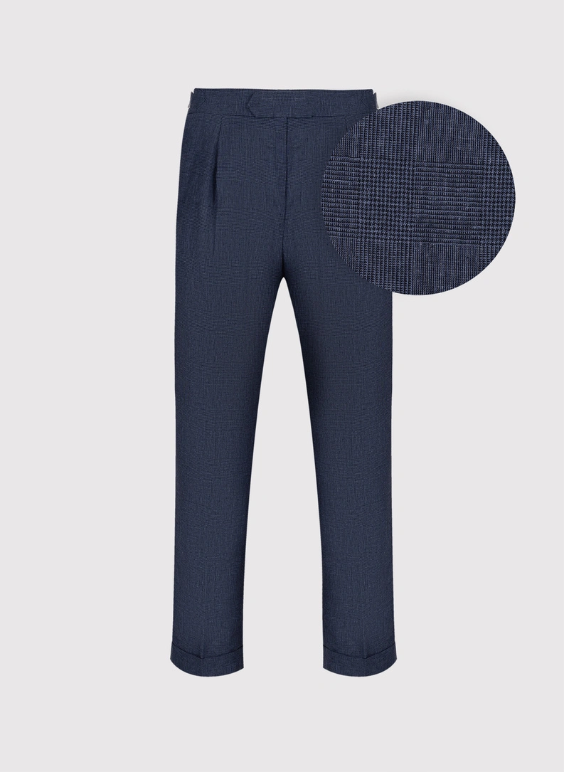 Drobna kratka na granatowym tle tworzy delikatną, równą strukturę wizualną materiału, która z bliska jest wyraźna, a z dalszej odległości subtelnie się stapia, dając wrażenie jednolitej, lekko ożywionej powierzchni. Tkanina z lnem ma delikatnie wyczuwalną pod palcami fakturę, charakterystyczną dla włókien roślinnych, co podkreśla ich letni, swobodny charakter. Spodnie świetnie odnajdą się w biurze z mniej formalnym dress codem, w zestawieniu z marynarką i koszulą lub lekkim swetrem. W stylu casual wystarczy dobrać do nich gładki T-shirt, koszulkę polo lub lekki pulower, aby stworzyć wygodny komplet na popołudniowe spotkania, wyjścia do restauracji czy weekendowe wyjazdy.