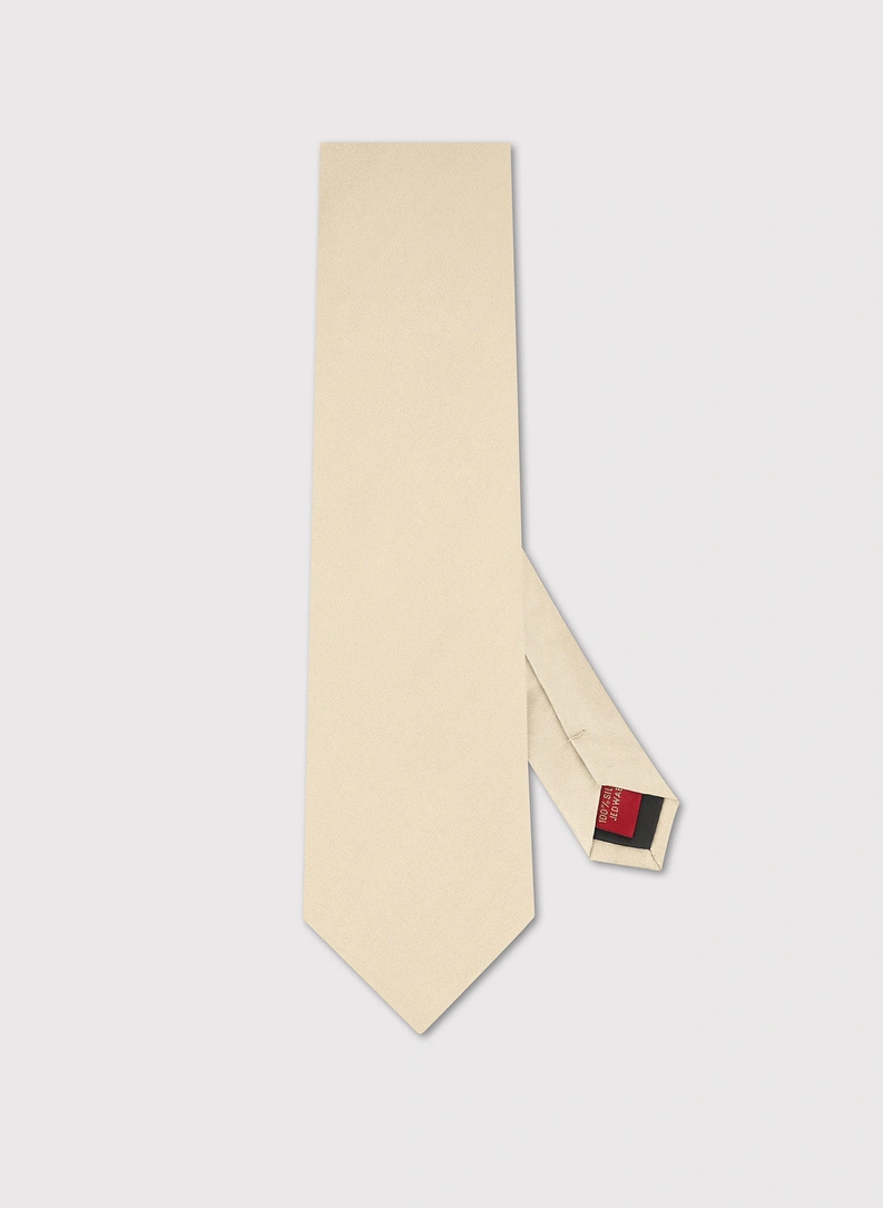 Gładka, jedwabna powierzchnia krawata podkreśla jego ponadczasowy, minimalistyczny charakter. Jasny beżowy kolor, widoczny na zdjęciach, ma szlachetny, ciepły ton, który nie dominuje stylizacji, lecz elegancko ją dopełnia. Standardowa szerokość 8 cm zapewnia zbalansowany wygląd – krawat nie jest ani ekstremalnie wąski, ani przesadnie szeroki, dzięki czemu świetnie współgra z klasycznymi i współczesnymi garniturami. Starannie opracowana konstrukcja pozwala na wiązanie zarówno prostych, jak i bardziej złożonych węzłów, takich jak four-in-hand czy half-Windsor, bez nadmiernego pogrubienia pod kołnierzykiem.