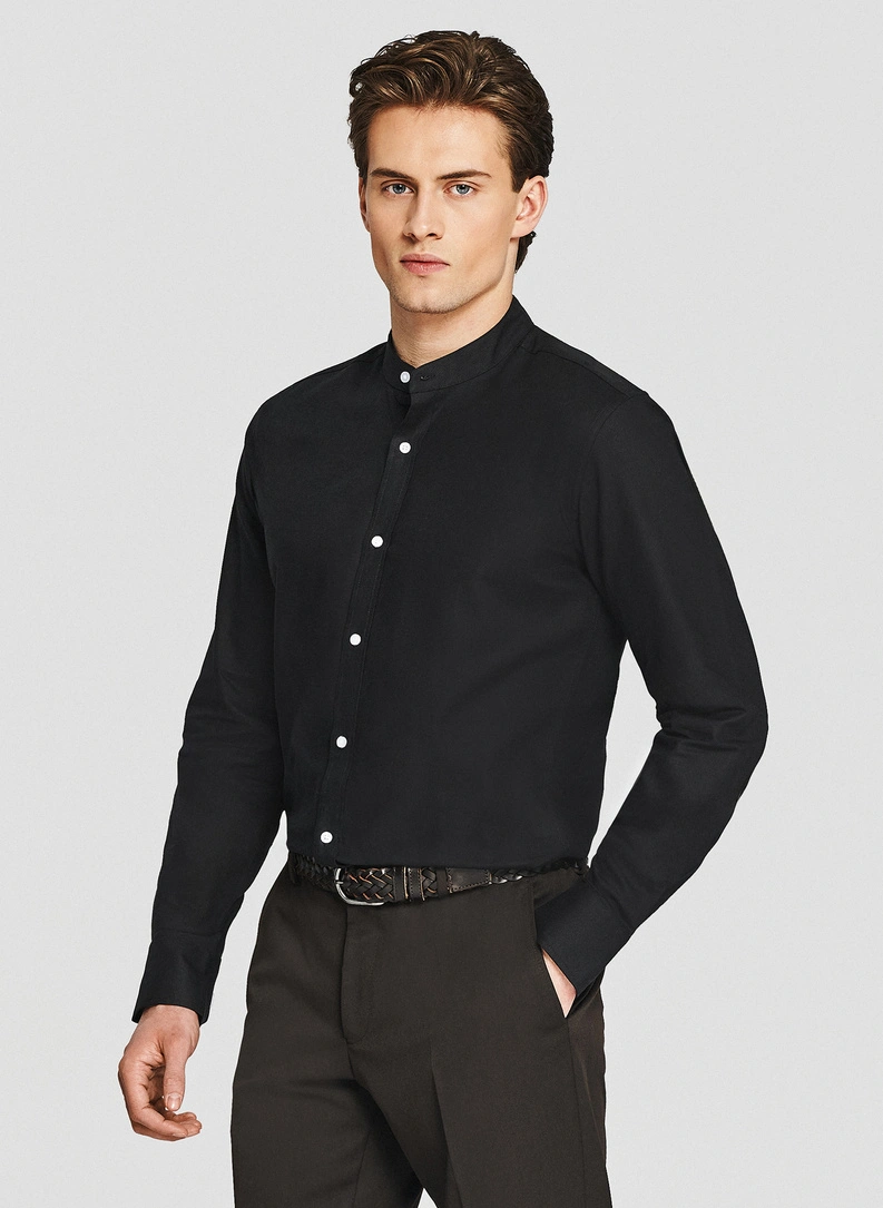 Lniana czarna koszula z kołnierzem stójką