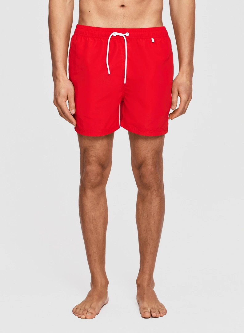 Szorty kąpielowe męskie w czerwonym kolorze mają prosty fason, który dobrze układa się na różnych typach sylwetki. Elastyczny pas u góry wyposażono w troczki, dzięki czemu można precyzyjnie wyregulować dopasowanie w talii i uniknąć zsuwania się materiału. Nogawki o klasycznej szerokości nie opinają ud, co ułatwia wykonywanie szerokich ruchów przy pływaniu kraulem, żabką czy podczas treningu aqua fitness. Wykończenia krawędzi opracowano tak, aby zminimalizować ryzyko obtarć, szczególnie w okolicy wewnętrznych szwów i dołu nogawek.