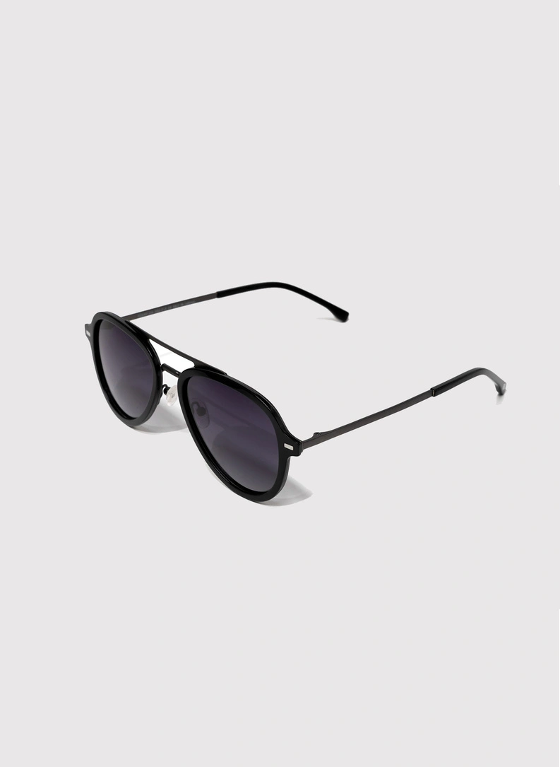 Kształt pilotek wyróżnia się charakterystycznymi, lekko opadającymi ku dołowi szkłami połączonymi cienkim mostkiem. Smukłe zauszniki subtelnie otaczają twarz, dzięki czemu okulary nie dominują w stylizacji, ale stanowią jej świadomy akcent. Czarny kolor oprawek i szkieł dodaje wyrazistości rysom twarzy, a jednocześnie sprawia, że model dobrze współgra z każdym typem urody. Gładka powierzchnia tworzywa sprawia, że okulary łatwo wyczyścić z odcisków palców czy drobnych zabrudzeń powstających w ciągu dnia.
