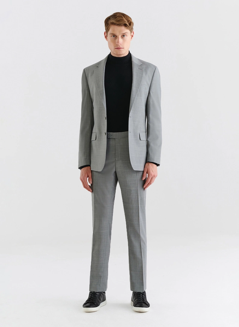 Męski garnitur w delikatną kratę. Model z najnowszej kolekcji Pako Lorente. Marynarka P23SF-3G-011-S-S i spodnie P23SF-6G-011-S-S tworzą elegancki garnitur. Garnitur w subtelną kratę Windowpane to wspaniała propozycja zarówno na formalne jak i codzienne okazje. Model o kroju Slim Fit, wykonany z 54% poliestru, 44% wełny i 2% lycry.